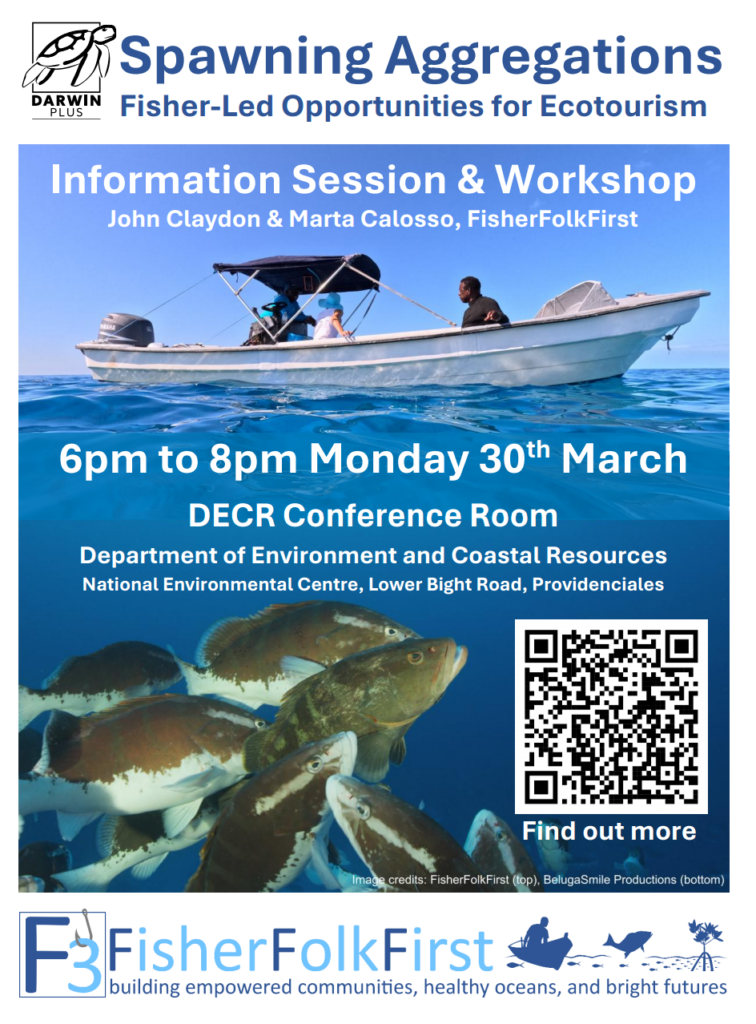 To explain the potential of spawning aggregation sites for fisher-led ecotourism, we have conducted training with fishers at spawning aggregation sites of parrotfishes (a family of fishes that you can no longer harvest in the Turks and Caicos Islands)